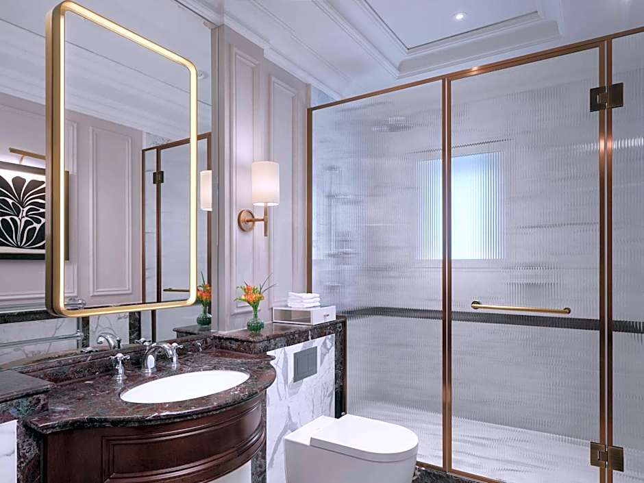 The spacious, luxurious marble bathrooms all feature a freestanding, claw foot bath, separate walk-in showers with the famous Savoy rain showerhead, a double vanity, large chrome fittings and Penhaligon's amenities.